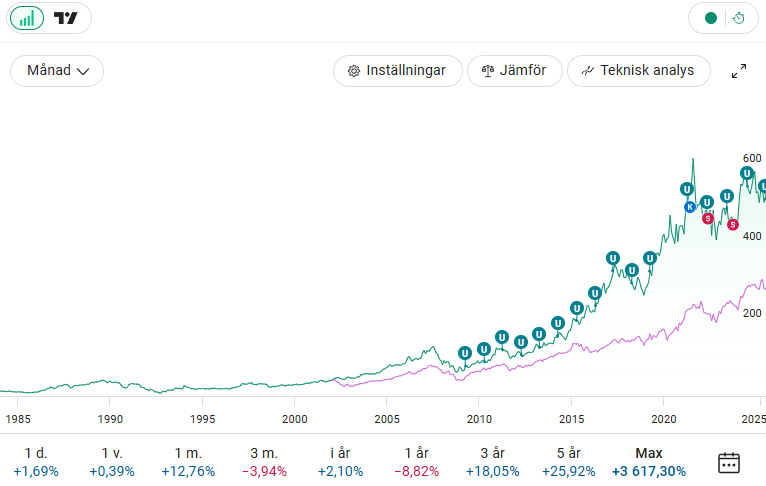 Utdelningarna i kronor ökar år för år då all avkastning återinvesteras. Den totala årsavkastningen på portföljen inkluderar utdelningar!
