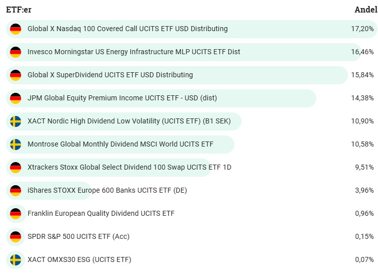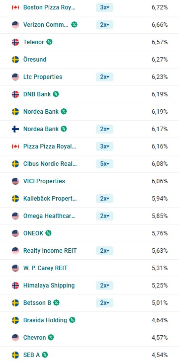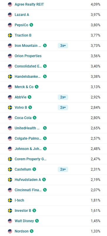Här visar vi de utdelningsbolag som vi har i vår utdelningsportfölj. Dom flesta utdelningar sker på månads & kvartals basis. Alla utdelningar återivesteras i utdelningsbolag för att få bästa avkastning med Ränta på Ränta effekten!